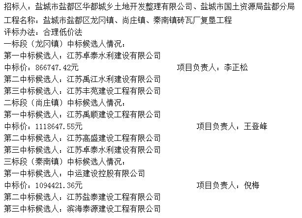 鹽城市鹽都區(qū)龍岡鎮(zhèn)、尚莊鎮(zhèn)、秦南鎮(zhèn)磚瓦廠復墾工程中標公示
