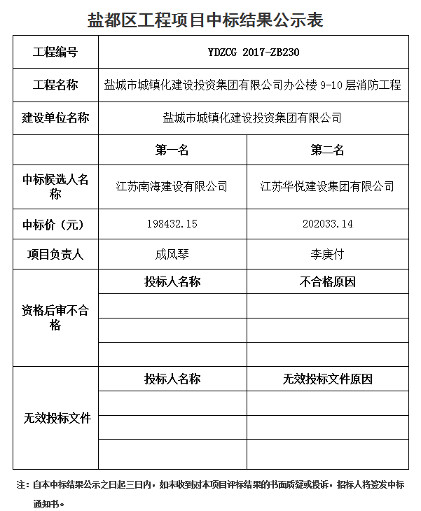 鹽城市城鎮(zhèn)化建設投資集團有限公司辦公樓9-10層消防工程中標結(jié)果公示