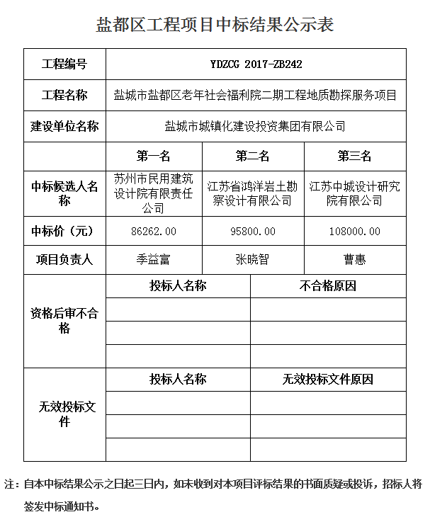 鹽都區(qū)老年社會(huì)福利院二期工程地質(zhì)勘探服務(wù)項(xiàng)目中標(biāo)結(jié)果公示