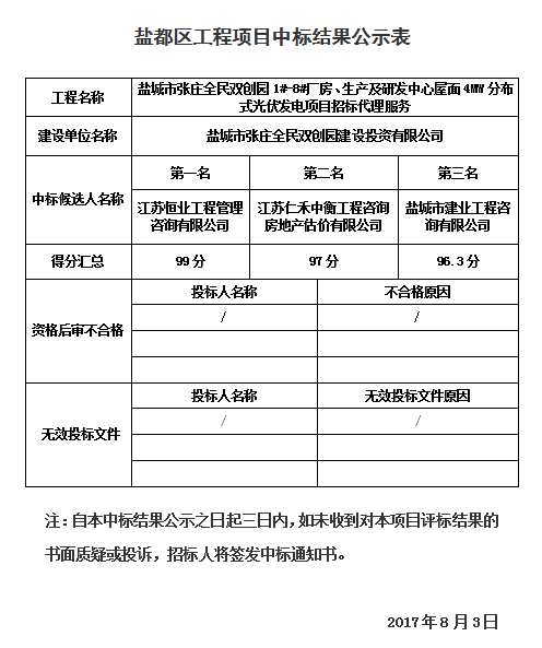 鹽城市張莊全民雙創(chuàng)園1#-8#廠房、生產(chǎn)及研發(fā)中心屋面4MW分布式光伏發(fā)電項(xiàng)目招標(biāo)代理服務(wù)中標(biāo)結(jié)果公示