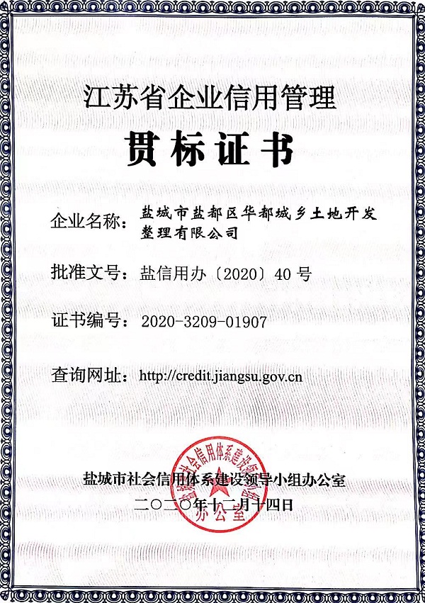 根據(jù)《“十三五”期間深入推進(jìn)全省企業(yè)信用管理貫標(biāo)和示范創(chuàng)建工作實(shí)施意見(jiàn)的通知》(蘇信用辦〔2016〕39號(hào))和《關(guān)于組織開(kāi)展2020年度企業(yè)信用管理貫標(biāo)和示范創(chuàng)建工作的通知》(鹽發(fā)改信用〔2020〕49號(hào))要求,經(jīng)企業(yè)申請(qǐng)、各縣(市、區(qū))推薦和第三方信用服務(wù)機(jī)構(gòu)實(shí)地評(píng)價(jià)等程序,我集團(tuán)子公司鹽城市鹽都區(qū)華都城鄉(xiāng)土地開(kāi)發(fā)整理有限公司符合2020年度省信用管理貫標(biāo)企業(yè)認(rèn)定標(biāo)準(zhǔn),榮獲江蘇省企業(yè)信用管理貫標(biāo)證書(shū)。