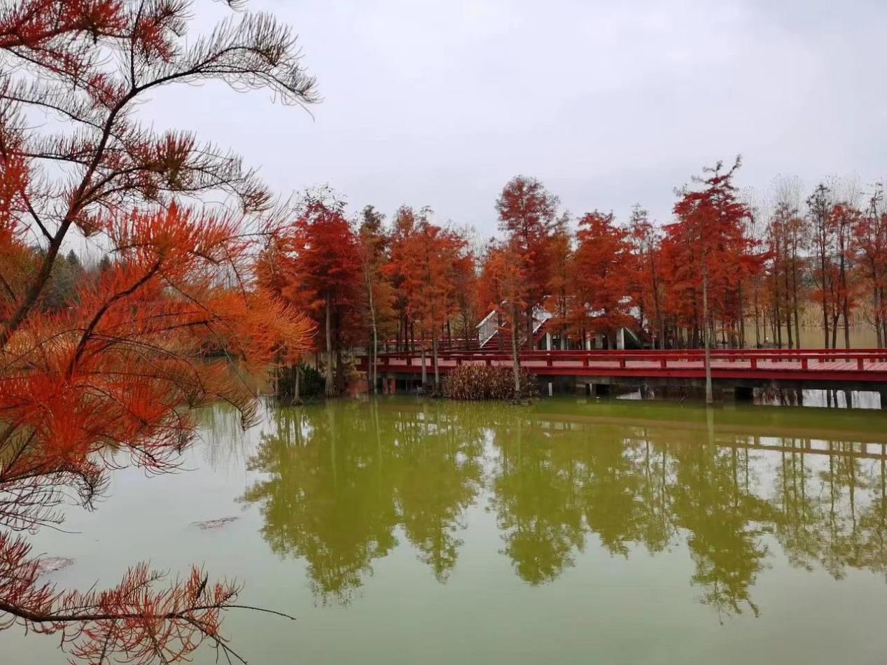 紅葉襯著綠樹,小橋伴著流水,既有曲徑通幽之妙,也有寬闊草地之美。公園集生態(tài)休閑、觀光旅游等功能為一體,游客可以在公園內(nèi)擁有濕地旅游、白果采摘、戶外燒烤等豐富多樣的出游體驗。