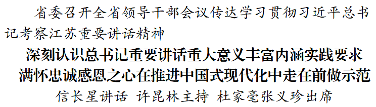 信長星指出,習(xí)近平總書記考察江蘇重要講話,統(tǒng)攬全局、指航定向,言近旨遠(yuǎn)、語重心長,是強國建設(shè)、民族復(fù)興宏偉藍(lán)圖在江蘇的具體化。要深刻領(lǐng)會總書記對江蘇一系列重要講話重要指示,在追根溯源中厘清脈絡(luò),在融會貫通中掌握要義,在一體落實中求取實效,做到學(xué)習(xí)貫徹更加全面、更加系統(tǒng)、更加深入。要深刻領(lǐng)會總書記對江蘇工作的勉勵,提高政治站位,保持清醒頭腦,堅定信心決心,把已經(jīng)取得的成績作為新的起跑線,持續(xù)補短板、強弱項、固底板、揚優(yōu)勢,用實實在在的發(fā)展成果實現(xiàn)更大突破、增創(chuàng)新的優(yōu)勢。要深刻領(lǐng)會總書記對江蘇明確的重大定位,把握“走在前、做示范”的豐富內(nèi)涵,知重負(fù)重、擔(dān)當(dāng)作為,在中國式現(xiàn)代化道路上勇于率先實踐、積累經(jīng)驗。要深刻領(lǐng)會總書記對江蘇工作提出的重大任務(wù),“四個新”既著眼中國式現(xiàn)代化戰(zhàn)略全局,又體現(xiàn)江蘇的基礎(chǔ)、優(yōu)勢和地位,是對江蘇工作要求的再明確、再拓展、再深化,必須逐條認(rèn)真領(lǐng)會、深入調(diào)查研究,謀深謀實、落細(xì)落成。要深刻領(lǐng)會總書記對主題教育提出的最新要求,匡正干的導(dǎo)向、增強干的動力、形成干的合力,凝心聚力促發(fā)展,乘勢而上開新局,推動高質(zhì)量發(fā)展和現(xiàn)代化建設(shè)邁上新臺階、展現(xiàn)新氣象。